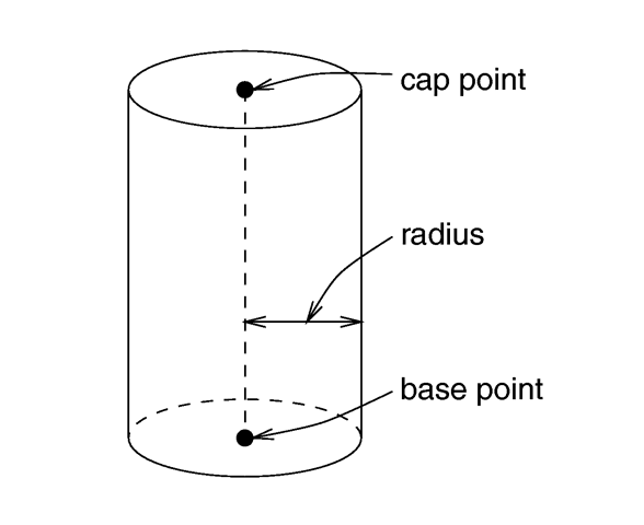 Where <Base_Point> and <Cap_Point> are vectors defining the x, y, z coordinates of the cylinder's base and cap and Radius is a float value for the radius.